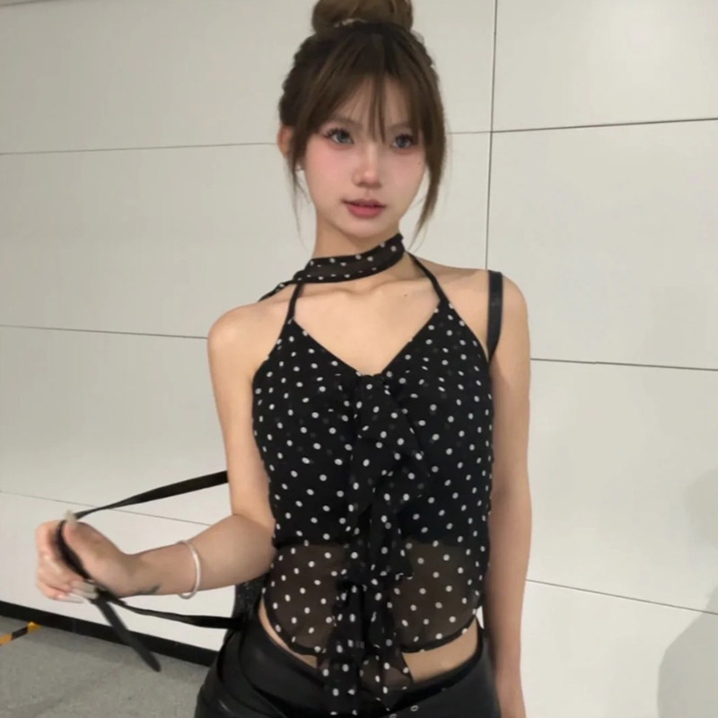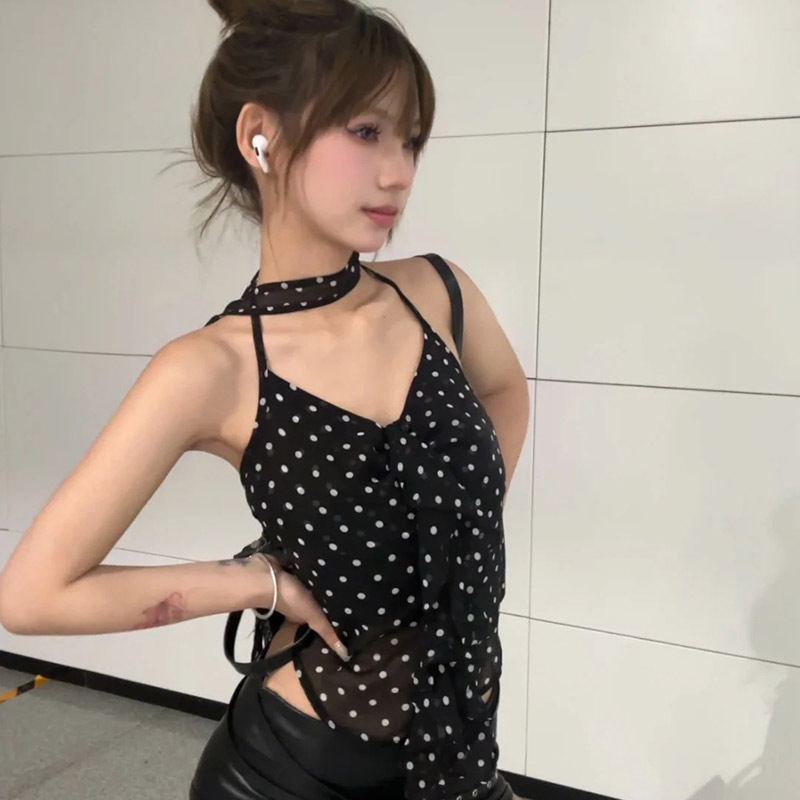 Polka Dot Micro Transparent Chiffon Halter Spaghetti Straps Vest